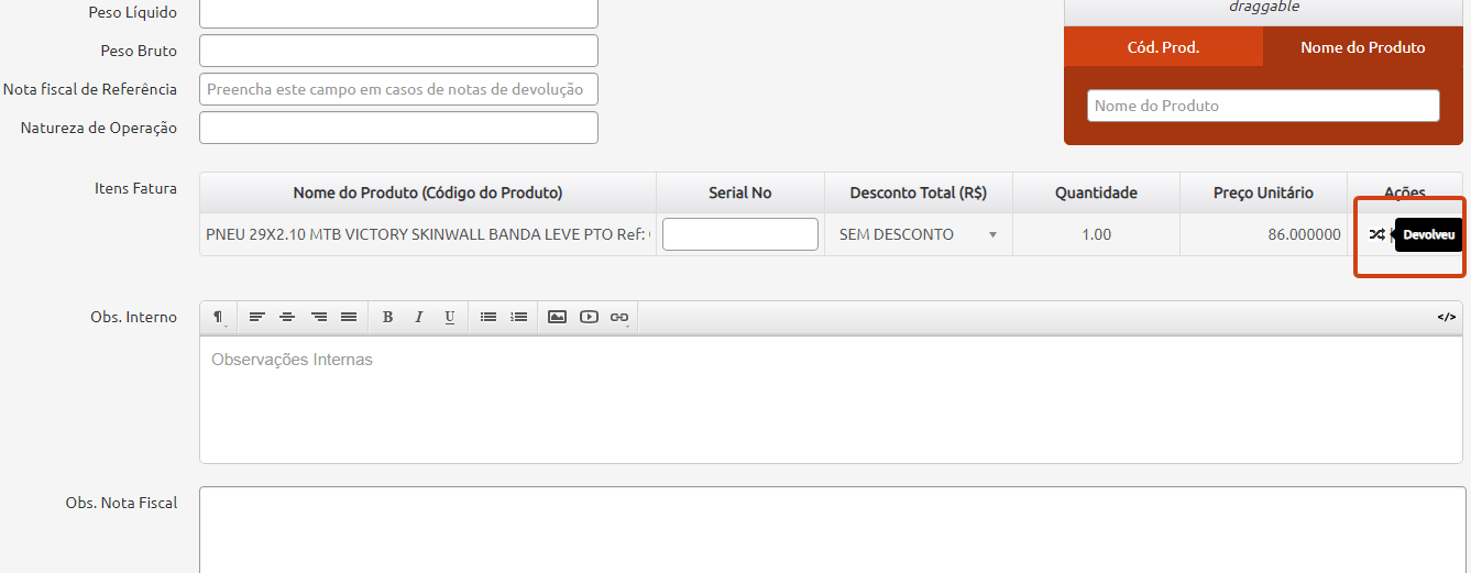 Clique no botão amarelo INSERIR TROCA e preencha com os códigos dos produtos que deseja devolver no estoque e com o total a ser descontado da venda.